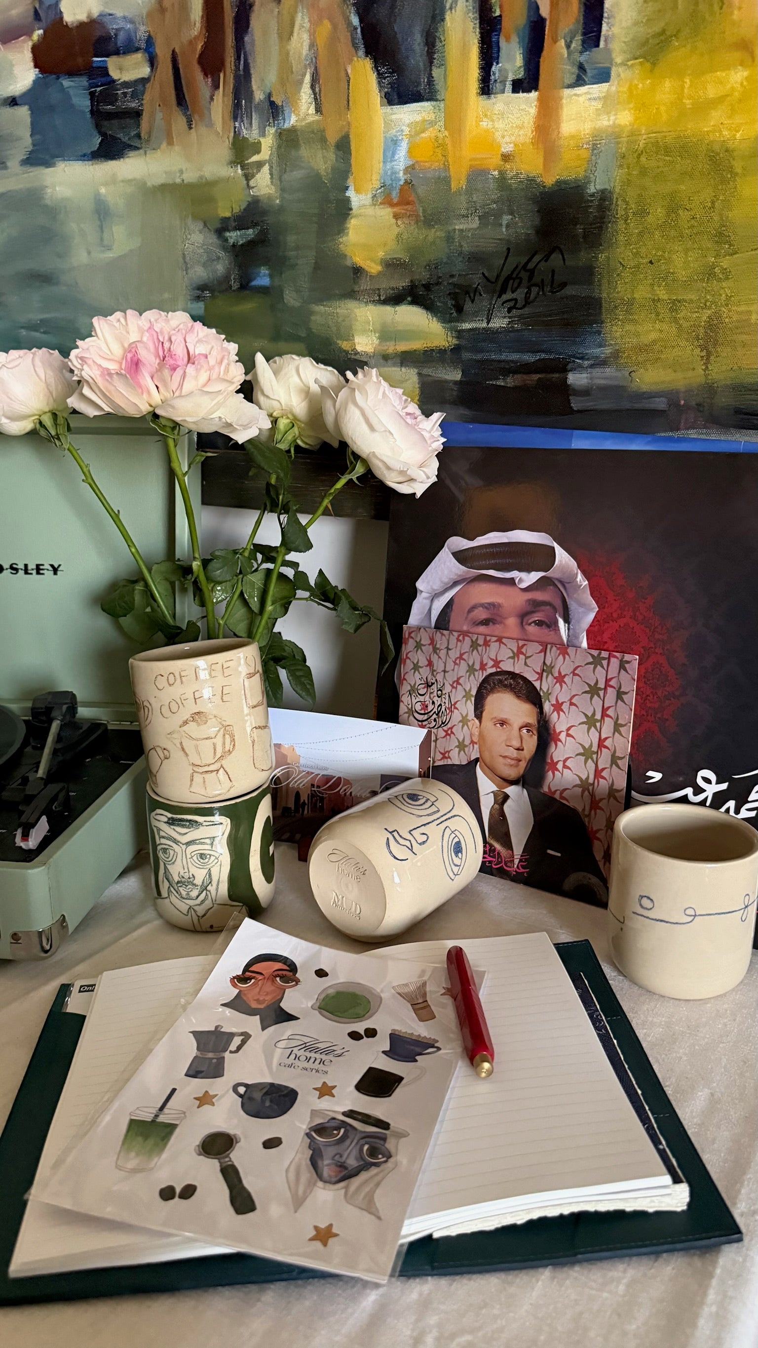 This one of a kind mug features a hand-drawn feminine face in Hala's abstract style on one side and a masculine face on the other side.